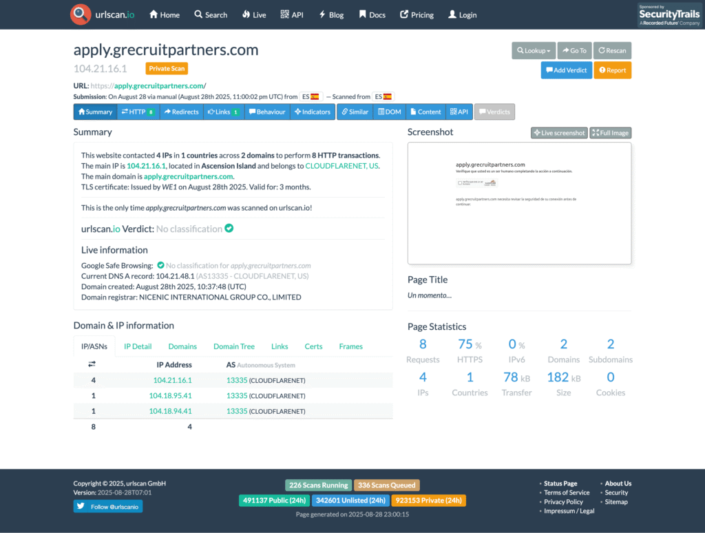 Empiezo a rascar el dominio. Ese “recruitpartners” sonaba serio, con su “apply” en plan portal de candidaturas. Pero no era ni Workday, ni Greenhouse, ni nada de lo que usan las grandes. Banderola roja!